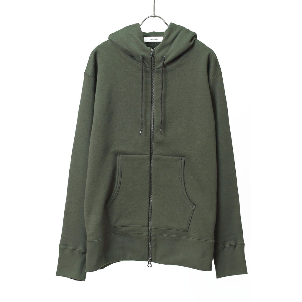 日本国内で非常に希少な旧式編み機「吊り編み機」で、ゆっくりと時間をかけて編み上げた「吊り裏毛(吊り編み裏毛)」生地を使用したジップパーカー(フーディー)です。